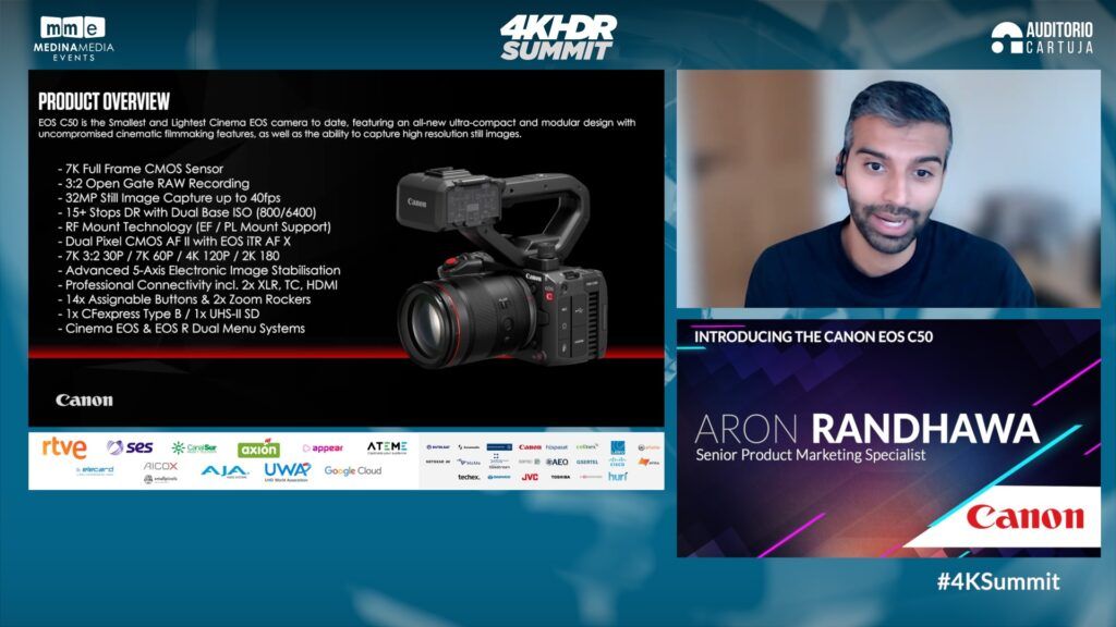 Por su parte, Canon presentó su nueva cámara cinematográfica EOS C50, “la más pequeña y ligera hasta la fecha”, según Aron Randhawa, Senior Product Marketing Specialist de Canon. Este modelo incorpora un sensor 7K con grabación RAW Open Gate, fotografías de 32 MP, más de 15 pasos de rango dinámico e ISO dual, ofreciendo una “calidad de imagen excepcional” tanto para producciones profesionales como para creadores de contenido digital. Además, su grabación simultánea en formato panorámico y vertical la convierte en una herramienta híbrida entre el cine y las redes sociales. Randhawa destacó que con la C50 buscan “combinar potencia cinematográfica y versatilidad digital” para responder a las nuevas demandas del mercado.