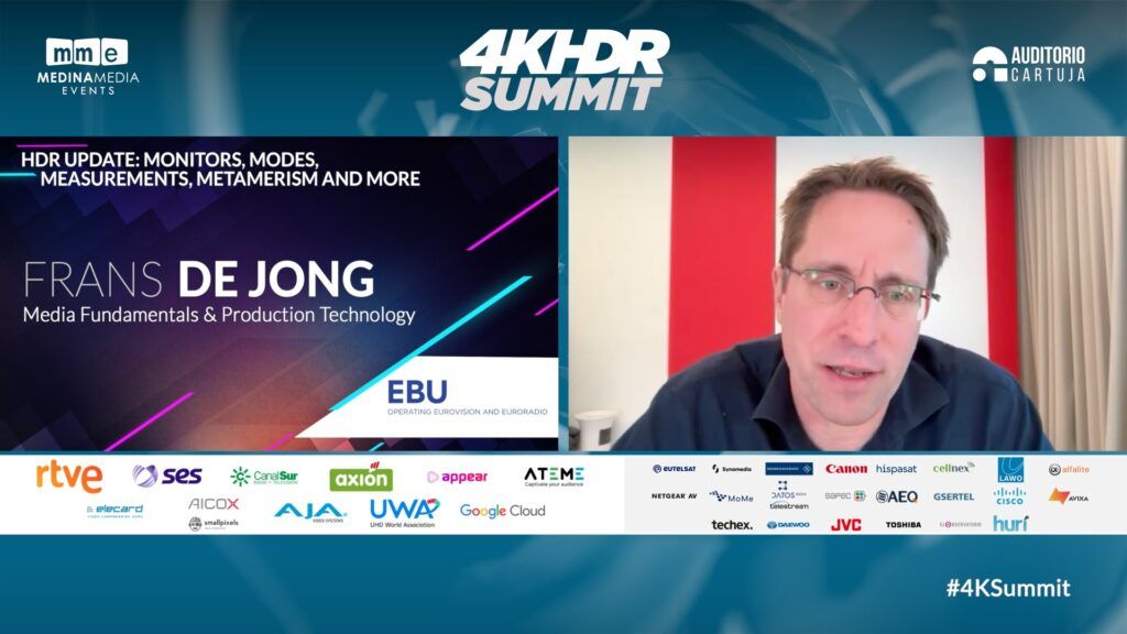 Por su parte, Frans de Jong, Media Fundamentals & Production Technology de la European Broadcasting Union (EBU), presentó las últimas pruebas de la organización en HDR y UHD, centradas en la mejora del color, la coherencia visual y la compresión. Explicó que las nuevas recomendaciones de la EBU buscan “estandarizar los modos de monitor HDR” y abordar el fenómeno del metamerismo, que altera la percepción del color. Las pruebas determinaron que “la compresión óptima en transmisiones UHD se sitúa entre 6:1 y 8:1” y que la compensación de movimiento “ofrece los mejores resultados en la conversión de fotogramas”. De Jong insistió en la importancia de “mantener el diálogo entre tecnología y producción” y en el papel de la nube y la inteligencia artificial como base de los flujos audiovisuales del futuro.