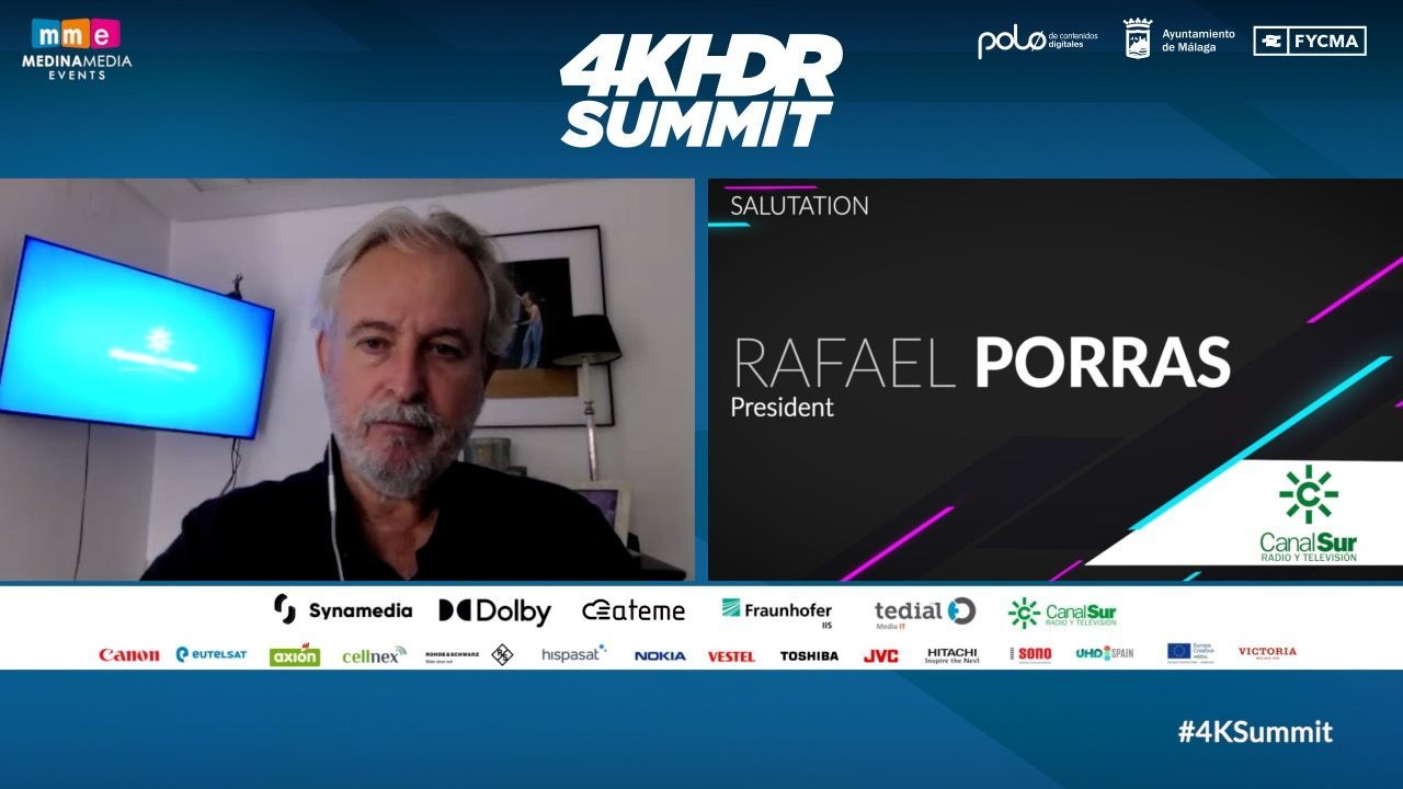 El cuarto día de la 4KHDR Summit 2021, llamado “Presidents’ Day”, ha comenzado con el Presidente del Consejo de Administración de la Radio Televisión de Andalucía (RTVA), Rafael Porras, que tradicionalmente da la bienvenida a los presidentes y máximo ejecutivos que participan en esta cita anual única en el mundo audiovisual como cadena anfitriona del evento y recientemente incorporada a la asociación UHD Spain.