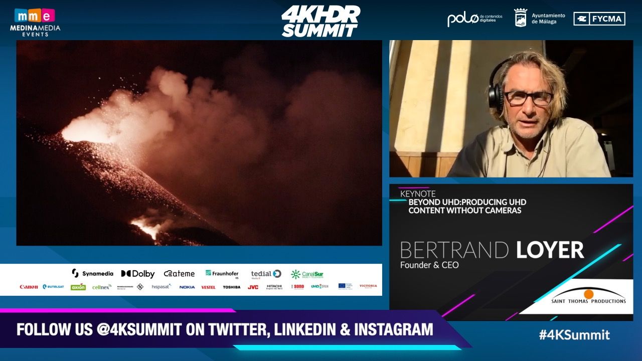 A continuación, Bertrand Loyer, presidente de Saint Thomas Productions, compartió con los asistentes impactantes imágenes grabadas en 8K del volcán de La Palma: “Durante nuestra experiencia filmando el volcán de La Palma hemos comprobado que la cámara puede ir más allá de la capacidad del ojo humano”. También habló de su actividad durante la pandemia: “Durante estos dos años de COVID hemos hecho varios desarrollos porque este tiempo nos ha dado la oportunidad de que otras personas del otro lado del mundo puedan rodar para nosotros con cámaras UHD y 8K en todo el planeta”.