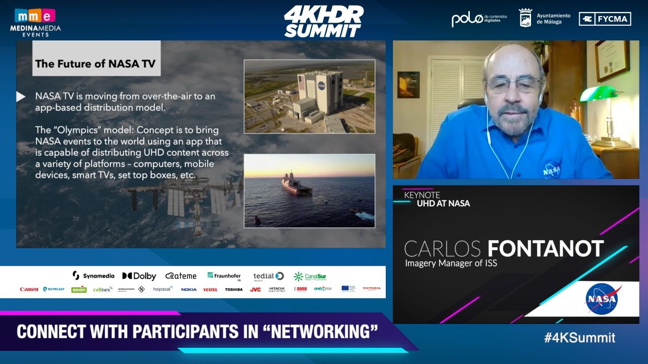 La agencia espacial estadounidense NASA también ha estado presente un año más en la 4KHDR Summit, con su responsable de Imágenes, Carlos Fontanot, quien ha mostrado los últimos avances con las nuevas cámaras utilizadas en la misión a Marte y en la Estación Espacial Internacional (ISS). «Los vídeos a bordo se grabarán en 4K y se descargarán como archivos, pero la bajada de vídeo en directo habitual seguirá siendo en HD», afirmó Fontanot.