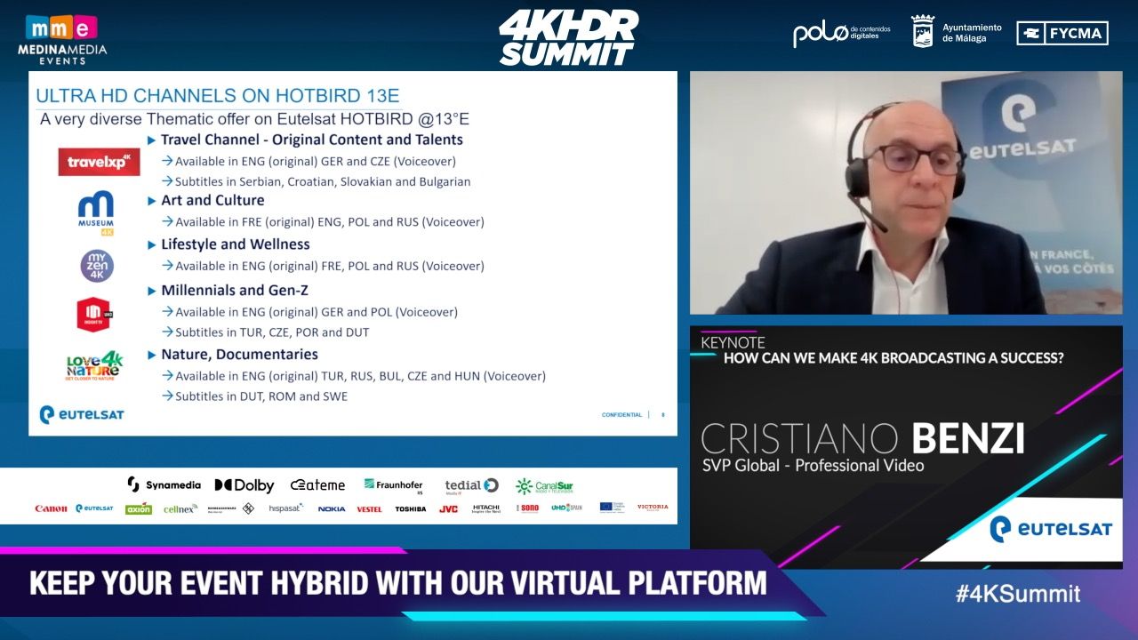 Cristiano Benzi, de Eutelsat, compartió el mapa de los 36 canales que actualmente emiten en 4K por satélite a través de Eutelsat, entre los que se encuentran cuatro canales «mainstream» que son editados por los principales grupos mediáticos para su propio uso y distribuidos principalmente en sus propias plataformas. Estos son: Sky Sport 4K, Canal + 4K, Eleven Sports y Rai 4K. «Los retos de la difusión de UltraHD son: la explotación del potencial de UltraHD, el coste del transporte y el parque de usuarios/receptores», afirmó Benzi.