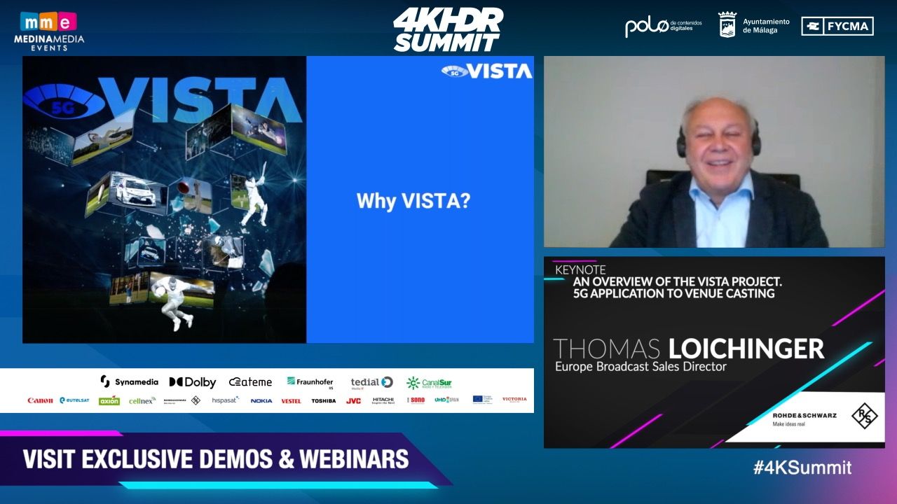 El 5G también ha sido protagonista en la tercera jornada de la 4KHDR Summit 2021. La alemana Rohde & Schwarz, representada por Thomas Loichinger, presentó su proyecto Vista 5G que planea usar tecnología broadcast 5G para generar nuevos procesos de interacción con eventos en directo, ya sea de música o deportes. «Según nuestra investigación, la mayoría de los consumidores que acuden a eventos en directo suelen utilizar sus smartphones en el evento (76% música – 77% deportes), siendo las funciones más utilizadas la fotografía, la mensajería, la filmación y las llamadas de voz», explicó Loichinger.