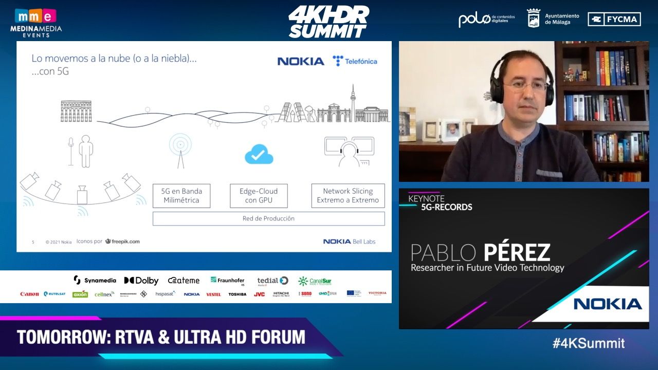 La finlandesa Nokia, representada por Pablo Pérez, también se apunta al 5G y ha apuntado que el punto clave para ellos es trasladar el sistema a la nube. «Puedes tener un operador de cámara en Madrid, incluso en su casa, operando una cámara virtual en una ciudad diferente lo que es posible gracias a nuestro control en un proceso E2E», afirmó Pérez.